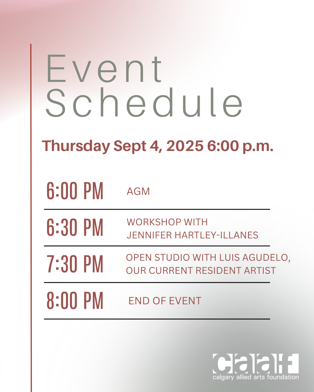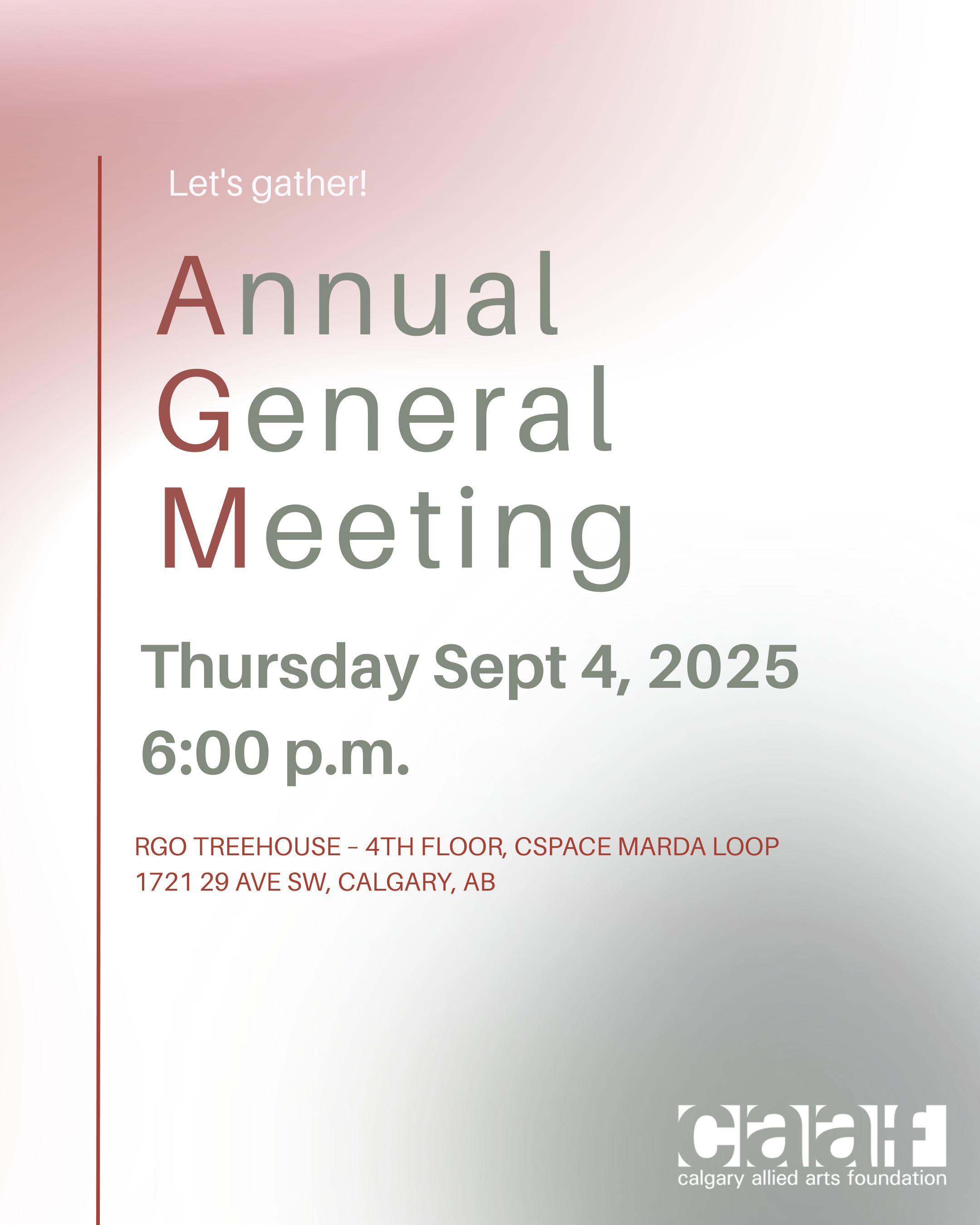 Notice is given that an Annual General Meeting of the Calgary Allied Arts Foundation will be held on Thursday, Sept 4, 2025, at 6:00 p.m. at cSpace Marda Loop in Calgary, Alberta, in order to elect a Board of Directors and to appoint auditors. Members in good standing are invited to attend and vote at this Meeting.